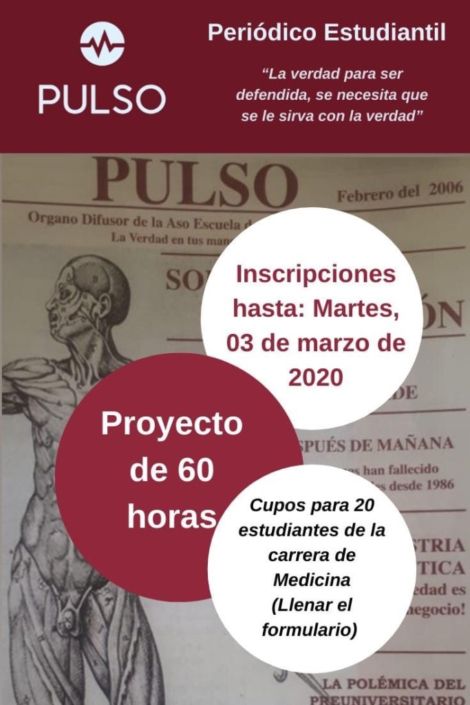 Estamos trabajando en un medio de estudiantes para estudiantes. La riqueza de opiniones nos permitirá crecer como facultad. Nuestro principal objetivo es retomar las publicaciones del diario estudiantil “PULSO” mediante la creación de una plataforma virtual a fin de mantener informada a la colectividad universitaria con énfasis en los estudiantes de la carrera de Medicina, finalizando el semestre con una publicación impresa de PULSO.