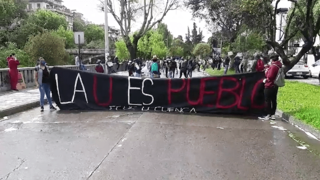 El día Miércoles 20 de mayo varios estudiantes de la Universidad de Cuenca y la Universidad Nacional de Eduación (UNAE) continuaron marchando desde los exteriores de la Universidad de Cuenca hasta el Centro Historico para hacer un plantón en los exteriores de la Gobernción del Azuay, defendiendo sus derechos y esperando llegar a ser escuchados.