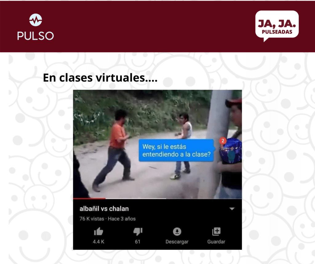 Noticias,Pulseadas ¡DIVIÉRTETE CON PULSO! mayo 6, 2021 Daniela Cornejo Deja un comentario Al mismo tiempo que deseamos mantenerte informado también queremos brindarte diversión, con nuestro segmento Pulseadas, no olvides echarle un vistazo a nuestros memes que seguramente te sacaran más de una sonrisa. Comparte esto: Compartir en X (Se abre en una ventana nueva) X Compartir en Facebook (Se abre en una ventana nueva) Facebook Compartir en WhatsApp (Se abre en una ventana nueva) WhatsApp Share on Pinterest (Se abre en una ventana nueva) Pinterest Me gusta Cargando...