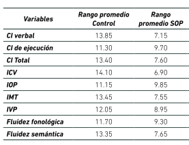 En el análisis se evidenció que los dos grupos obtuvieron puntuaciones de coeficiente intelectual en un rango normal (igual o mayor a 90), sin embargo, las participantes con SOP presentaron puntajes inferiores sobre todo en comprensión verbal, memoria de trabajo considerada en la escala de WAIS y la fluidez verbal semántica en la escala de NEUROPSI en comparación con el grupo con control (4).