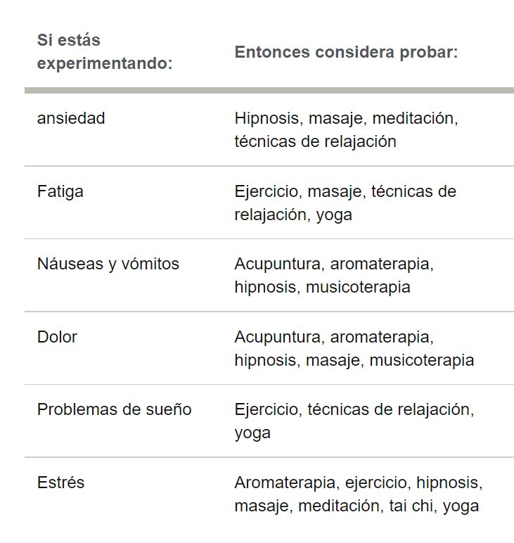 Algunos métodos complementarios o alternativos son sugeridos durante el tratamiento para reducir el estrés y el dolor del paciente.