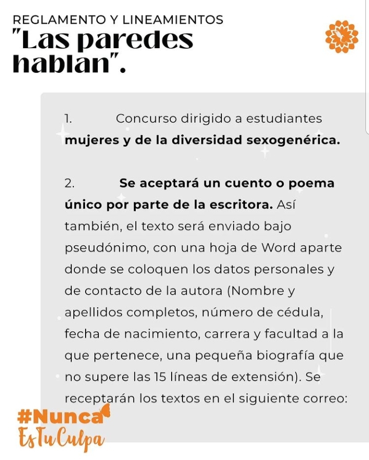 Mensaje: En el marco de los 16 días de activismo por la no violencia hacia la mujer te invitamos a ser parte de nuestro concurso «Las paredes hablan» para resistir, resurgir y existir desde los cuentos y la poesía. Para información adicional, contáctate con nosotras al 0998236025.