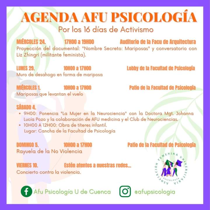 Además de esta actividad, la Asociación Femenina Universitaria en trabajo conjunto con la red AFU de distintas facultades de la Universidad, han elaborado una agenda de actividades a desarrollarse en conmemoración al #25N y a los 16 días de activismo por el Día Internacional de la Eliminación de la Violencia contra la mujer.