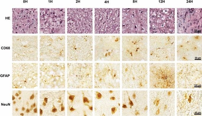 Realizan el estudio histopatológico (tinción con hematoxilina y eosina) y se obtienen que: las NeuN (neuronas): se fueron degradando lentamente entre 0-2horas, y entre la 4 y 8 hora existe una reducción de la tinción nuclear, lo que demuestra el deterioro paulatino con el paso de las horas, mientras que la microglía (CD68) y los astrocitos (GFPA) entre la 4 y 12 hora se activan y se mantienen incluso hasta las 24 horas, como vemos en la imagen: